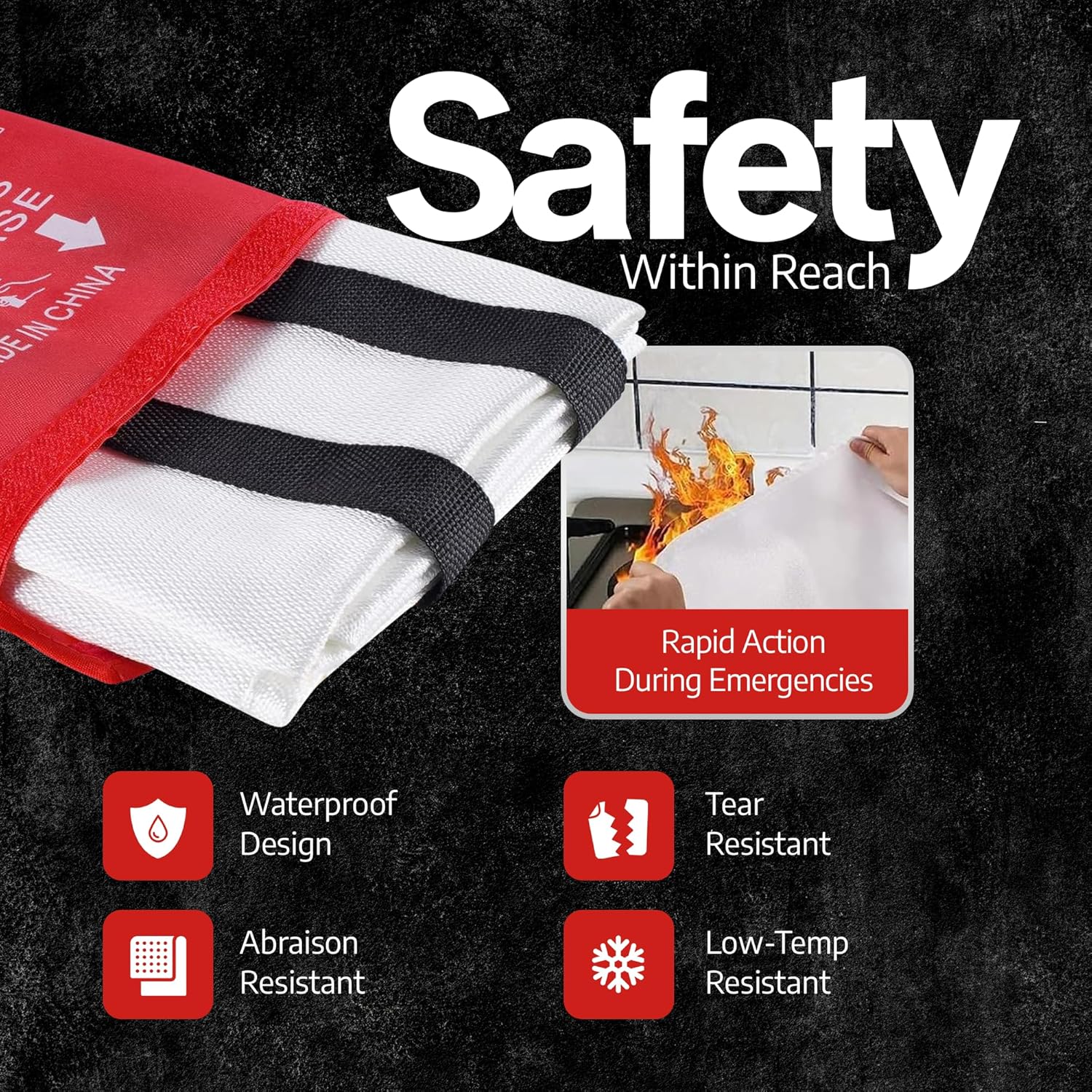Our emergency fire blanket offers several advantages over traditional fire extinguishers. It is easy to use, requires no training, and is effective in smothering small fires. The fiberglass material is also non-conductive, meaning it won’t shock you when in contact with live electrical wires. Additionally, the blanket is compact and lightweight, making it easy to store in a convenient location.